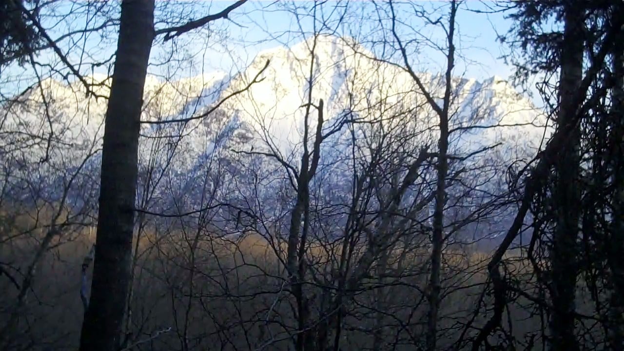 Then it gets better, about 600 feet back the land drops off steeply so that you are standing at the edge of a bluff at least 50 feet high looking right at Pioneer Peak. This would be a fantastic spot for a cabin, or a nice house. In fact, if you had the heart to cut them all down, I think there might be enough big spruces on the land to build a nice cabin.