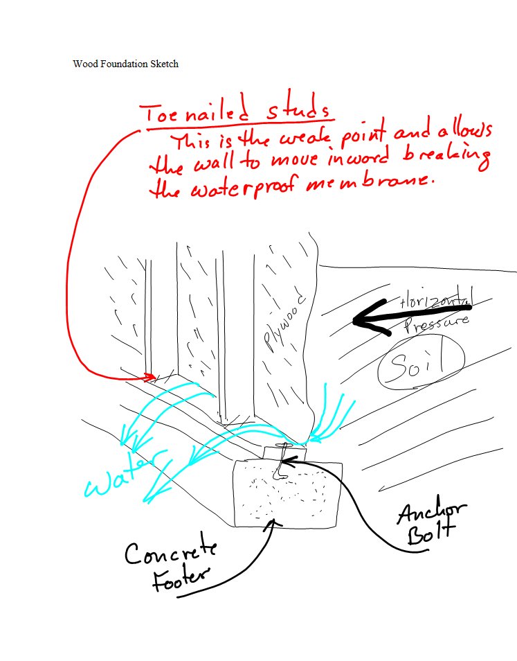 The problem is a that a wall built this way is not strong enough to withstand the horizontal force created by the backfill constantly pushing against it. Our ground freezes and thaws every year and ice expands when it freezes. The weak spot is where the studs are toe nailed to the sill plate. I can almost guarantee that every house built this way has the studs sliding back over the sill plate at least a little. It only takes a little movement to break the waterproof membrane down near the top of the footer. If there is any water collected in that area it will make it’s way into the crawl space. This water creates more problems associated with excess moisture in the house.